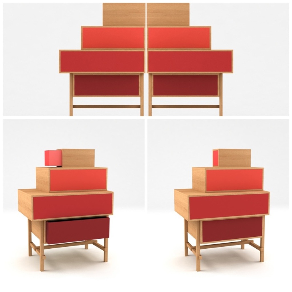 iA container unit made of different pieces, which “responds to the need to put in order from the smallest to the largest object according to everyone’s organization”. The drawers, apparently stacked at random, are supported by a structure that allows to move them in order to create new surfaces to be used as shelves.